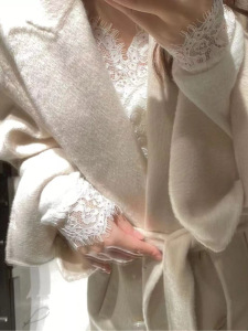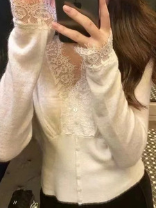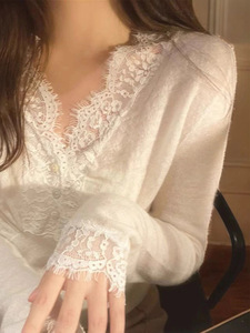 白色V领蕾丝打底衫女内搭秋冬季洋气显瘦紧身针织衫外搭长袖小衫