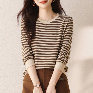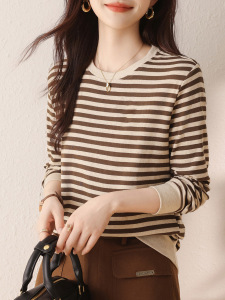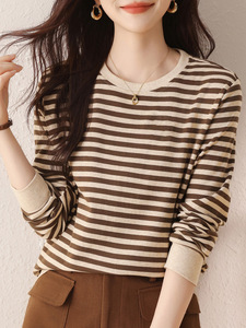 哥家商场同款女装2025秋季文艺简约气质圆领经典撞色条纹长袖T恤