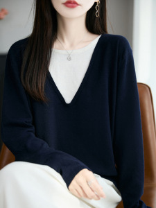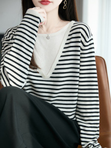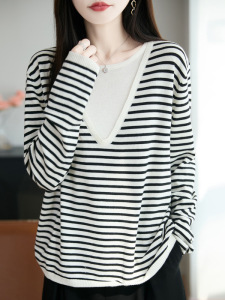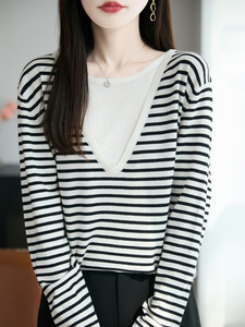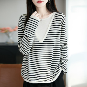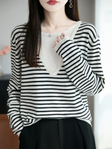 假两件条纹针织毛衣女精纺羊毛拼色宽松慵懒风韩版长袖打底上衣