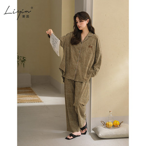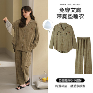 栗茵春秋季带胸垫奥力棉女士长袖长裤睡衣可外出小众家居服套装