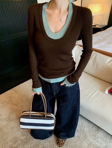 绵羊毛撞色假两件坑条衫复古气质V领修身显瘦长袖衣