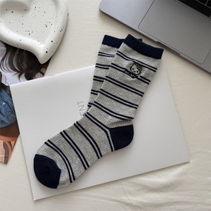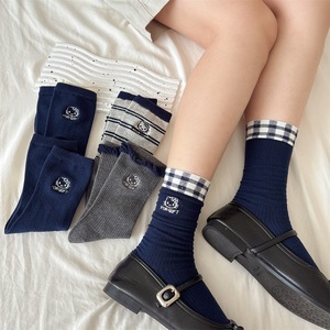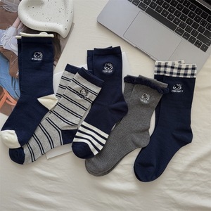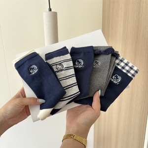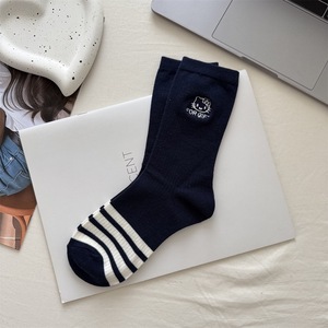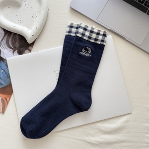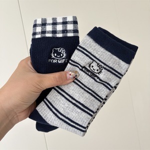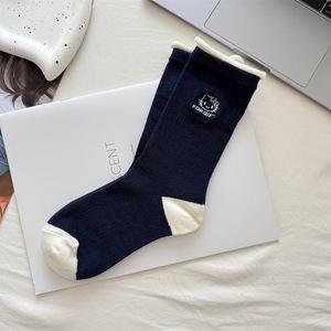 KT猫可爱刺绣袜子女秋冬新款蓝色拼接双罗口泡泡学院风中筒堆堆袜