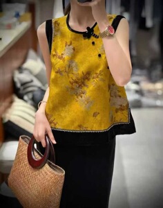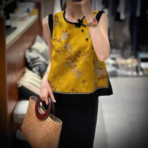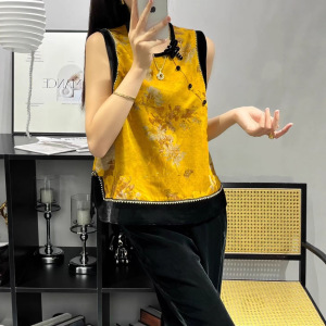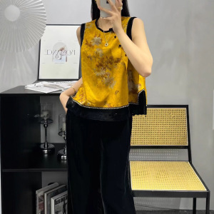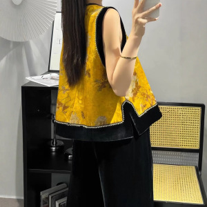 2025真丝丝绒背心上衣圆领领口蜻蜓装饰拼接提花印花百搭时尚马甲