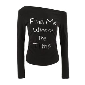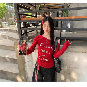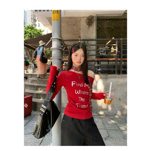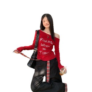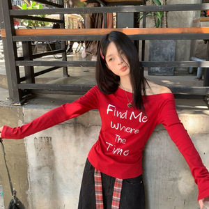 红色斜肩长袖t恤女秋季新款内搭露肩字母印花独特辣妹显瘦上衣潮