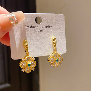 14k真金电镀银针轻奢锆石幸运小草花朵耳环法式宫廷风高级感耳饰