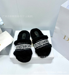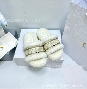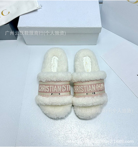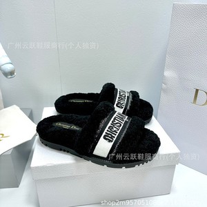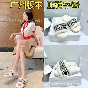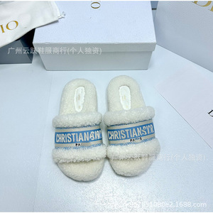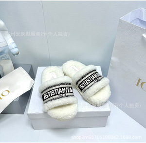 秋冬新款D家毛毛拖鞋女刺绣字母平底一字拖保暖百搭羊羔毛平底拖