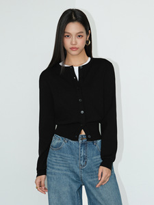 NEVA HU黑色长袖针织开衫女春秋毛织外套复古圆领气质短款上衣