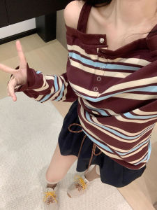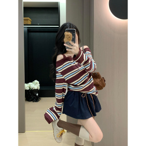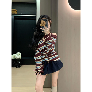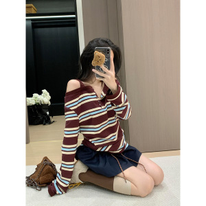 辣妹风长袖T恤女春秋季小众撞色条纹修身显瘦打底衫百搭露肩上衣