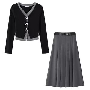 送皮带早秋新款针织开衫半身裙套装女高腰显瘦百褶裙气质两件套