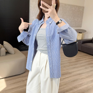 条纹衬衫抗皱免烫质设计感腰高腰衬衫露肩