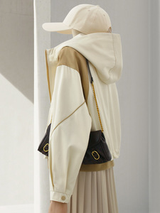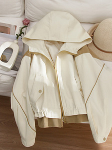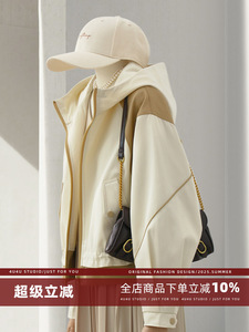 4U4U 春季新款米白色拼接设计感连帽外套女韩版通勤气质短款上衣