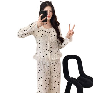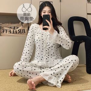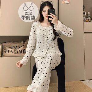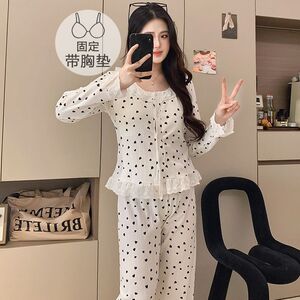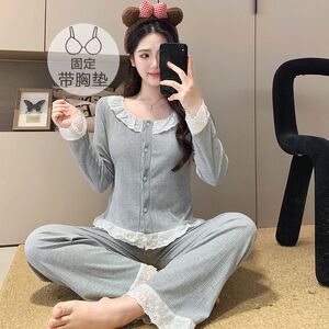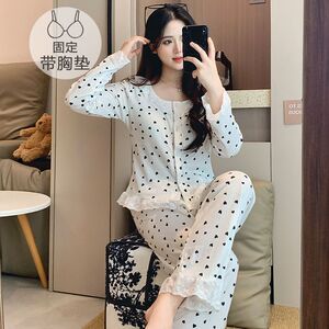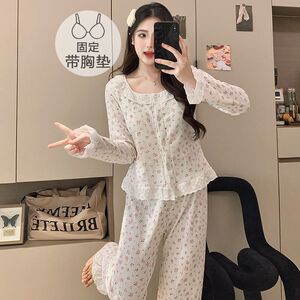 带胸垫睡衣女士新款春秋季甜美公主风花边长袖套装韩系休闲家居服