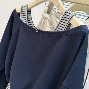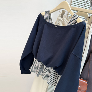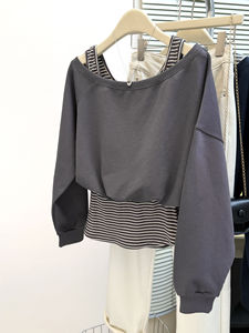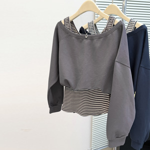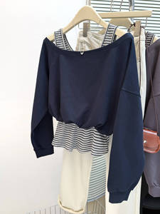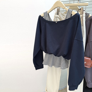 外贸实拍假两件拼接长袖卫衣女早春秋宽松韩版条纹斜肩露肩上衣