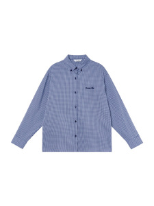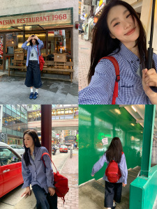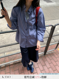 你好卡农 复古撞色蓝格纹刺绣长袖衬衫女春新款宽松显瘦衬衣