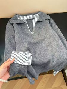 广州十三行高货爆款~拼接衬衫polo领假两件毛衣女2025秋季针织衫