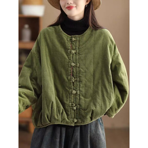 冬季复古全棉细条绒夹棉外套女重工炒色加厚棉衣盘扣棉服保暖棉袄