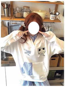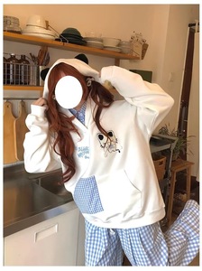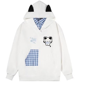 美式复古格子拼接猫咪刺绣假两件连帽卫衣女秋冬新款宽松闺蜜装
