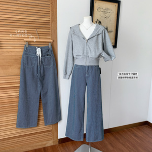 槿一'复古航线'牛仔蓝色高腰绑带条纹牛仔直筒裤女复古气质设计感