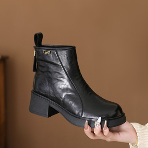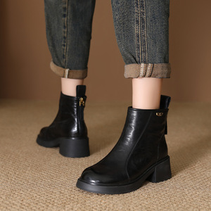 头层牛皮2025秋冬新款短靴女复古粗跟百搭棉靴保暖马丁靴女中老年