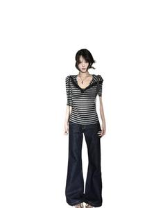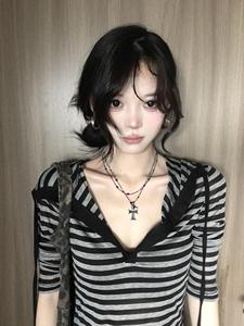 条纹连帽帽衫长袖t恤女韩系气质早秋季修身设计显瘦复古百搭上衣