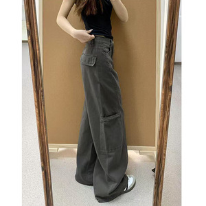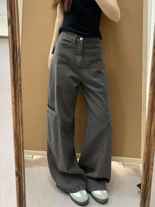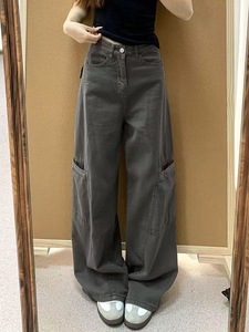 大码复古美式工装牛仔裤女秋季胖mm梨形身材高腰显瘦直筒阔腿裤子