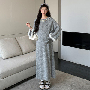 网红同款孕妇装2025秋冬新款加厚拼毛毛喇叭袖毛衣半身裙气质套装