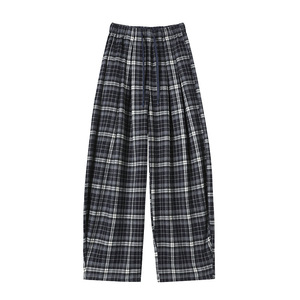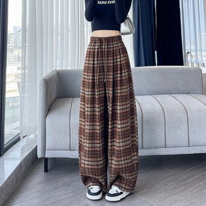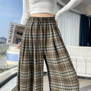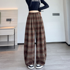 复古格子休闲长裤女秋季新高腰显瘦阔腿直筒裤美式高街弯刀拖地裤