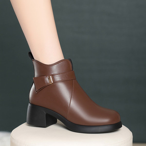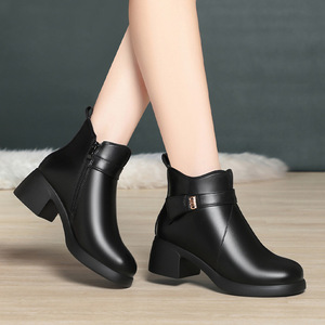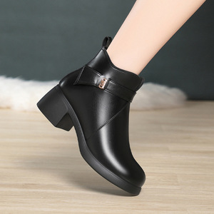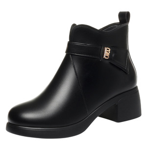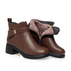 一件代发秋冬妈妈鞋棉鞋加绒保暖皮鞋短筒靴子粗跟女鞋中老年短靴