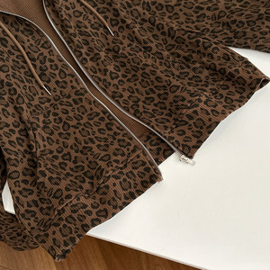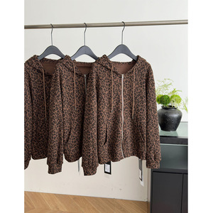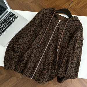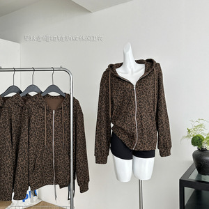 华夫格豹纹连帽卫衣女薄款2025新款初秋宽松显瘦美式慵懒拉链外套