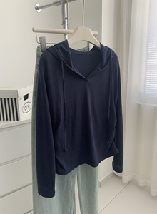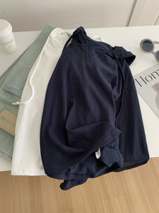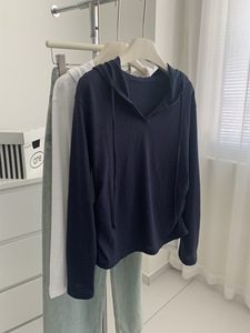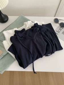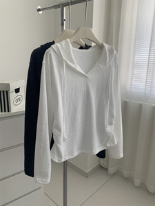 2025秋季韩系百搭麻感棉纯色连帽衫女捏褶收腰显瘦短款V领长袖T恤