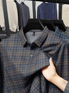 秋装时尚拼色商务长袖格子衬衫男士宽松舒适翻领开衫中年百搭寸衫