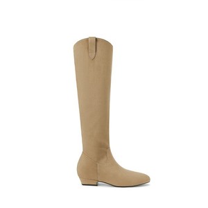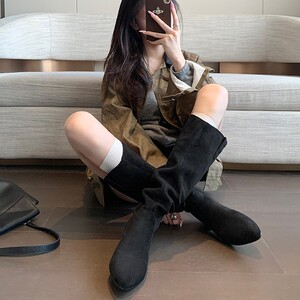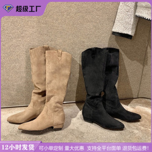 2025秋冬新款V口长筒靴女美拉德尖头绒面高筒内增高堆堆靴粗跟