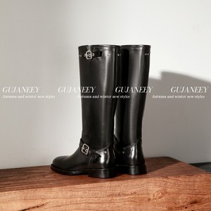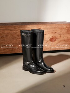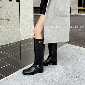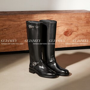 欧洲站女鞋25秋冬时尚软胎牛皮圆头休闲舒适款套筒平底皮带扣长靴