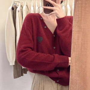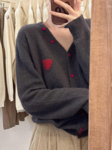 毛衣外套女小个子灰色v领短款开衫春秋季爱心刺绣针织衫长袖上衣