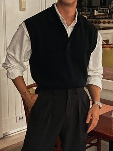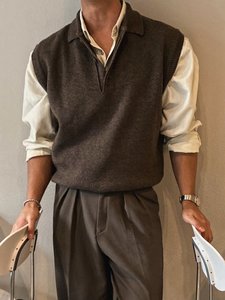 韩版休闲polo领针织衫时尚马甲春秋小众美拉德深棕色毛衣背心坎肩
