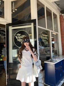 aaaaxbbb 法罗群岛 翻领撞色针织T恤套装气质上衣百褶裙半身裙女