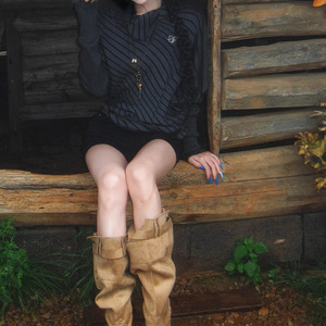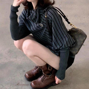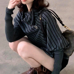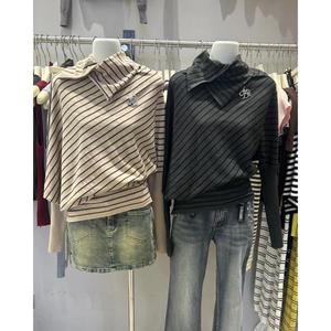 穿搭女早秋2025新款慵懒风复古条纹蝙蝠袖宽松高领针织上衣