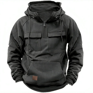 跨境秋冬新款男式连帽纯色卫衣 欧美青年运动多口袋贴皮卫衣外套