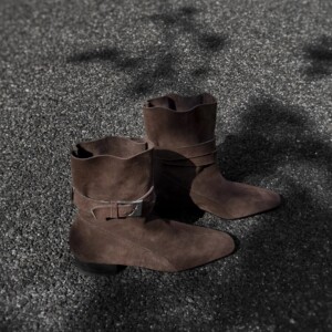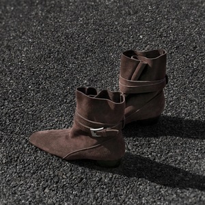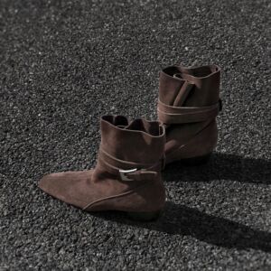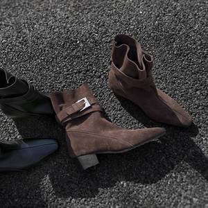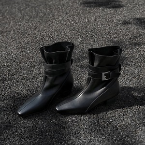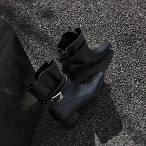 3.5cm复古套筒两穿方头短靴女2025秋季新款皮带扣粗跟束口时装靴