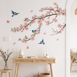 植物枝条花卉贴纸花朵小鸟背景墙可移除自粘墙贴亚马逊贴画 39065