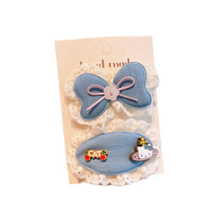 秋季牛仔布蝴蝶结蕾丝花边儿童发夹卡通猫咪公主百搭甜美刘海BB夹