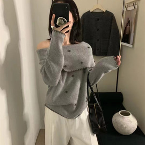 韩系高级感气质波点一字肩套头针织上衣秋冬新款宽松洋气百搭毛衣