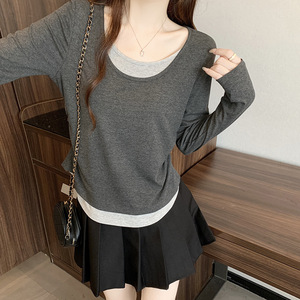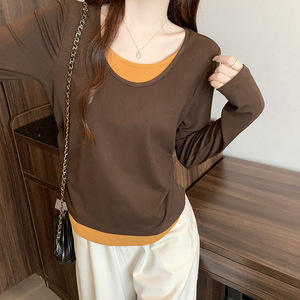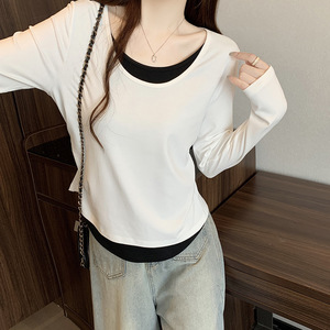 2025秋装新款胖mm大码女撞色设计感假两件正肩长袖上衣