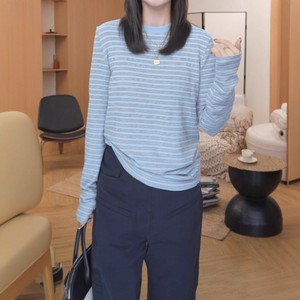 蓝色条纹长袖T恤女大码女装秋季新款宽松显瘦小个子减龄打底上衣