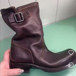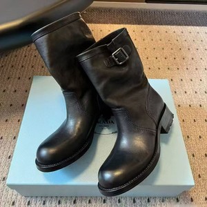 高端2025P家秋冬真皮圆头复古粗跟皮带扣百搭中筒马丁靴骑士靴女