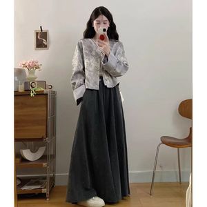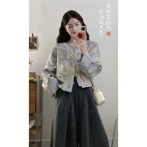 大码新中式国风套装女秋冬高级感上衣胖MM显瘦复古半身裙裤两件套