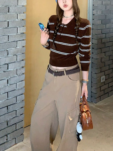 韩版复古撞色条纹长袖针织开衫女超好看的小个子显瘦穿搭套头上衣