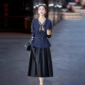 长袖牛仔上衣套装裙女秋季2025新款时髦洋气减龄穿搭皮半裙两件套