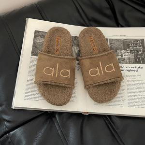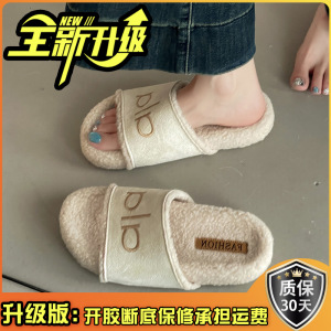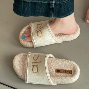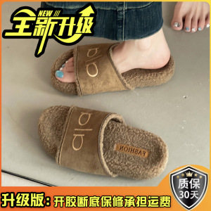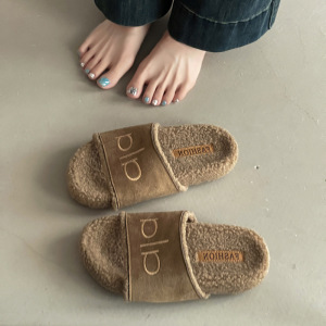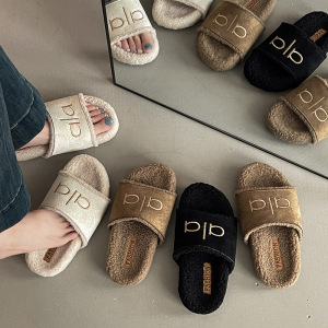复古风刺绣字母女生毛毛拖鞋秋冬季时尚百搭休闲方头一字棉拖鞋子
