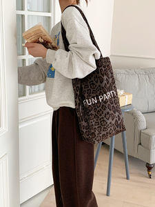 秋冬新款复古毛绒豹纹单肩包休闲大容量通勤包托特包时尚水桶包女